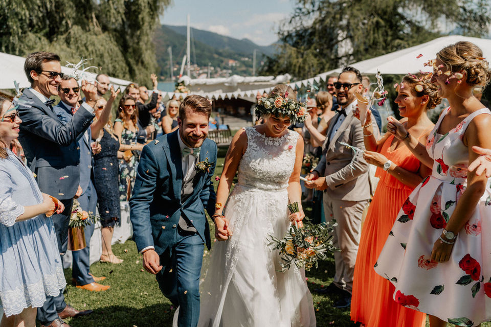 Es folgte eine freie Trauung mit Katharina Neudorfer von Strauß & Fliege am Ufer des Tegernsees. Bei der anschließenden Party im toll dekorierten Bootshaus wollte man eigentlich gar nicht, dass dieser Tag einmal zu Ende geht!